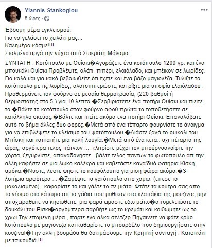 Με χιουμοριστική διάθεση προσεγγίζει την καραντίνα στο σπίτι ο Γιάννης Στάνκογλου, ο οποίος μοιράζεται με τους διαδικτυακούς του φίλους στο facebook μία συνταγή μαγειρικής που του έστειλε ο Σωκράτης Μάλαμας.