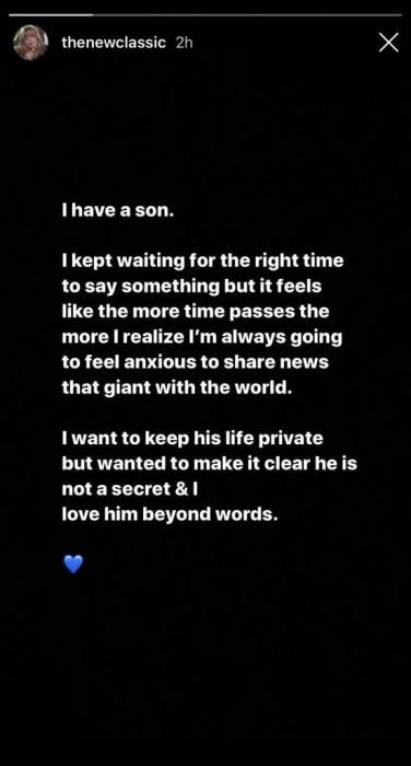 «Έχω έναν γιο! Το κρατούσα μυστικό για να το αποκαλύψω την κατάλληλη στιγμή. Θέλω να ξεκαθαρίσω ότι θα κρατήσω την ζωή του ιδιωτική, όχι όμως μυστική και τον αγαπώ απεριόριστα» έγραψε στον προσωπικό της λογαριασμό στο instagram.