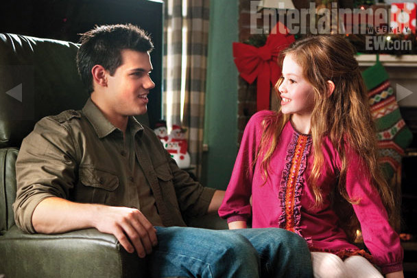 O Jacob κάθεται με την αγαπημένη του μικρή Renesmee, την κόρη της Bella και του Edward, με την οποία “αποτύπωσε”- μια έκφραση που στην αργκό του έπους σημαίνει “βρήκε το άλλο του μισό”.