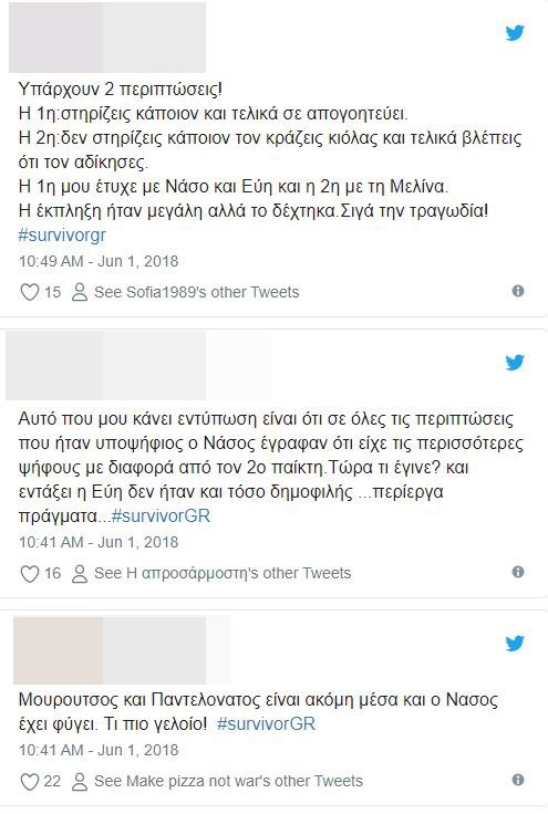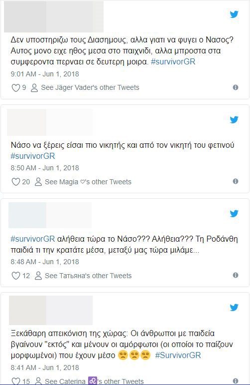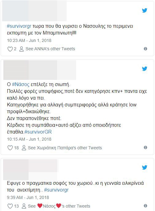 Ωστόσο, το τηλεοπτικό κοινό δυσαρεστήθηκε και το Twitter πήρε… φωτιά, καθώς ο Νάσος ήταν ένας από τους πιο αγαπητούς παίκτες του ριάλιτι επιβίωσης και πολλοί σχολίασαν αρνητικά το γεγονός πως δεν θα συνεχίσει στο παιχνίδι.