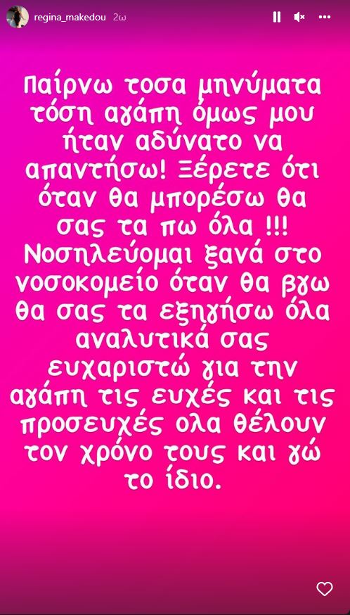 Τελικά η Ρεγγίνα Μακέδου επανήλθε σήμερα στα social media, γράφοντας: “Παίρνω τόσα μηνύματα, τόση αγάπη όμως μου ήταν αδύνατο να απαντήσω! Ξέρετε ότι όταν θα μπορέσω θα σας τα πω όλα. Νοσηλεύομαι ξανά στο νοσοκομείο, όταν θα βγω θα σας τα εξηγήσω όλα αναλυτικά, σας ευχαριστώ για την αγάπη, τις ευχές και τις προσευχές όλα θέλουν τον χρόνο τους και εγώ το ίδιο”.