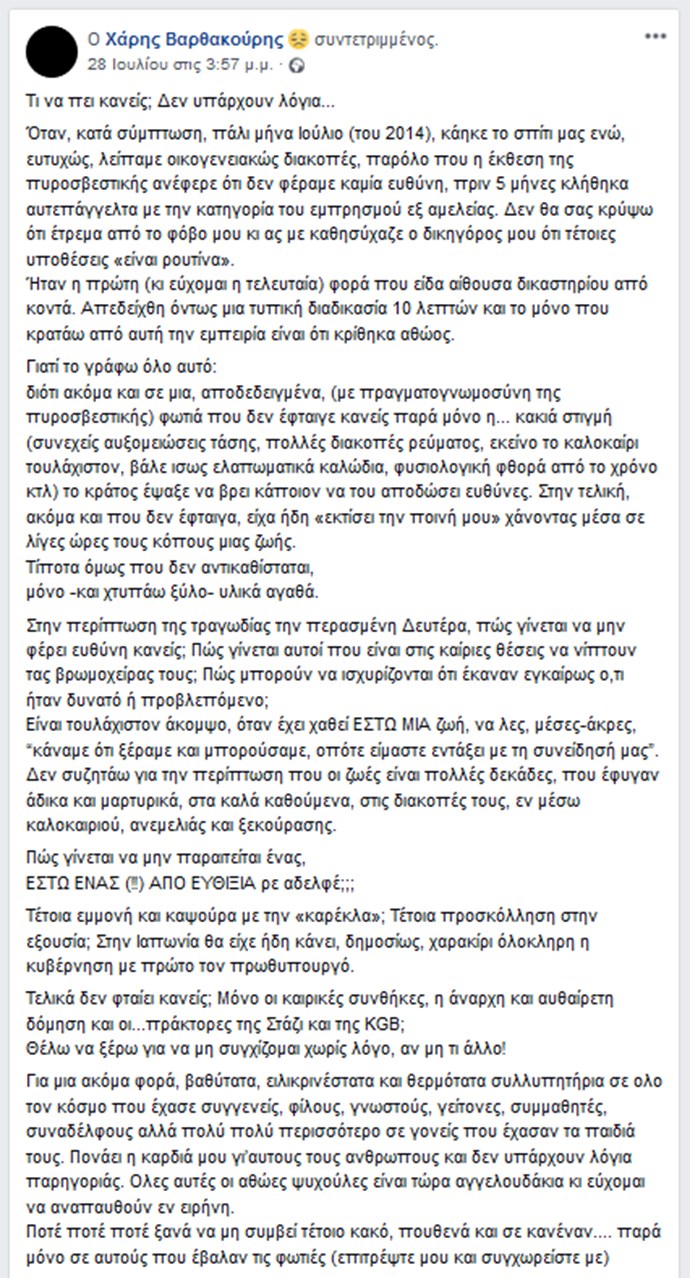 “Όταν, κατά σύμπτωση, πάλι μήνα Ιούλιο (του 2014), κάηκε το σπίτι μας ενώ, ευτυχώς, λείπαμε οικογενειακώς διακοπές, παρόλο που η έκθεση της πυροσβεστικής ανέφερε ότι δεν φέραμε καμία ευθύνη, πριν 5 μήνες κλήθηκα αυτεπάγγελτα με την κατηγορία του εμπρησμού εξ αμελείας. Δεν θα σας κρύψω ότι έτρεμα από το φόβο μου κι ας με καθησύχαζε ο δικηγόρος μου ότι τέτοιες υποθέσεις «είναι ρουτίνα»”, έγραψε χαρακτηριστικά ο γιος του Γιάννη Πάριου.