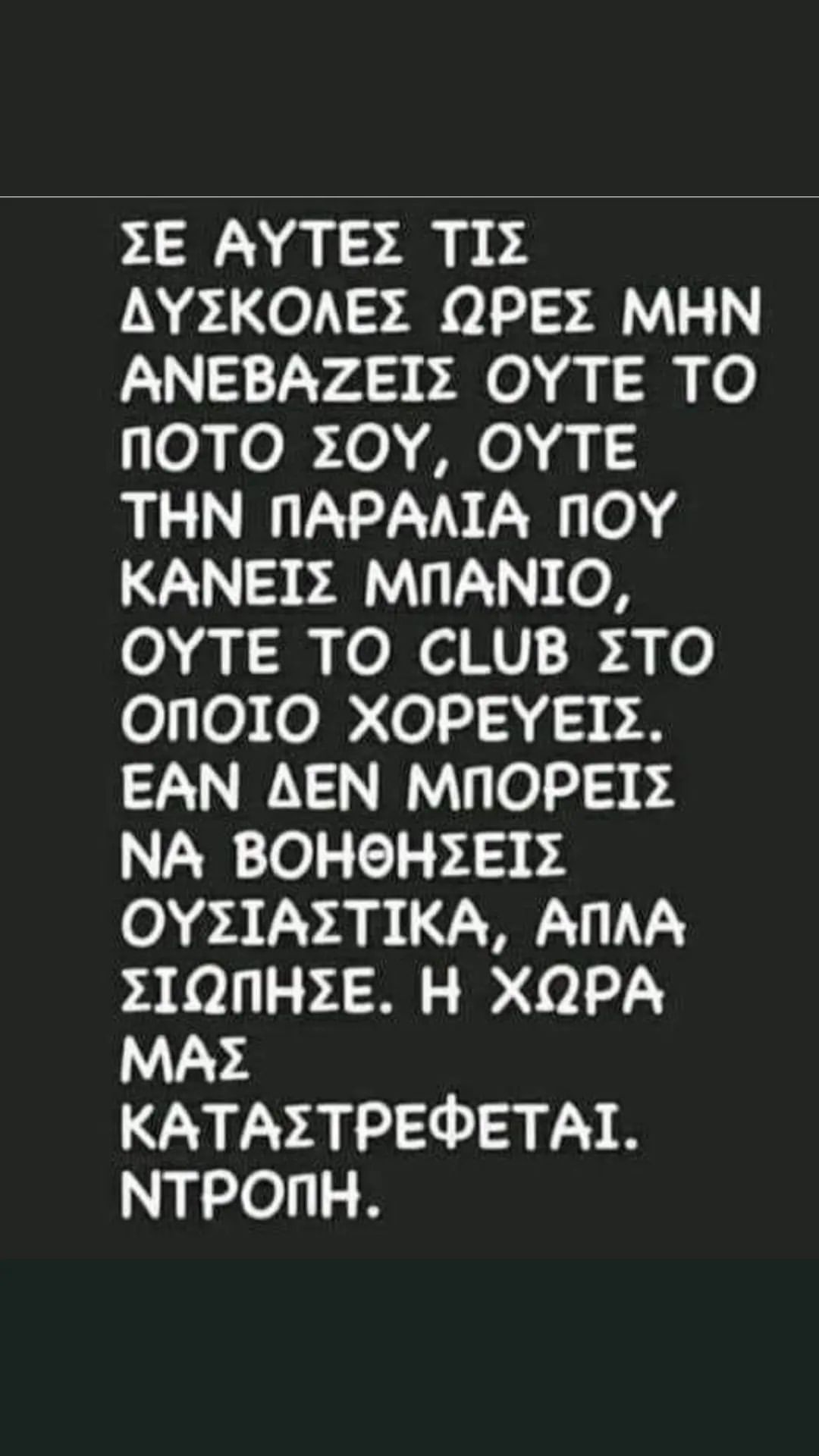 Συγκεκριμένα πριν από λίγη ώρα η ηθοποιός κοινοποίησε σε story στο instagram προφίλ της, ένα κείμενο στο οποίο γράφει: «Σε αυτές τις δύσκολες ώρες μην ανεβάζεις ούτε το ποτό σου, ούτε την παραλία που κάνεις μπάνιο, ούτε το club στο οποίο χορεύεις. Εάν δεν μπορείς να βοηθήσεις ουσιαστικά, απλά σιώπησε. Η χώρα μας καταστρέφεται. Ντροπή».