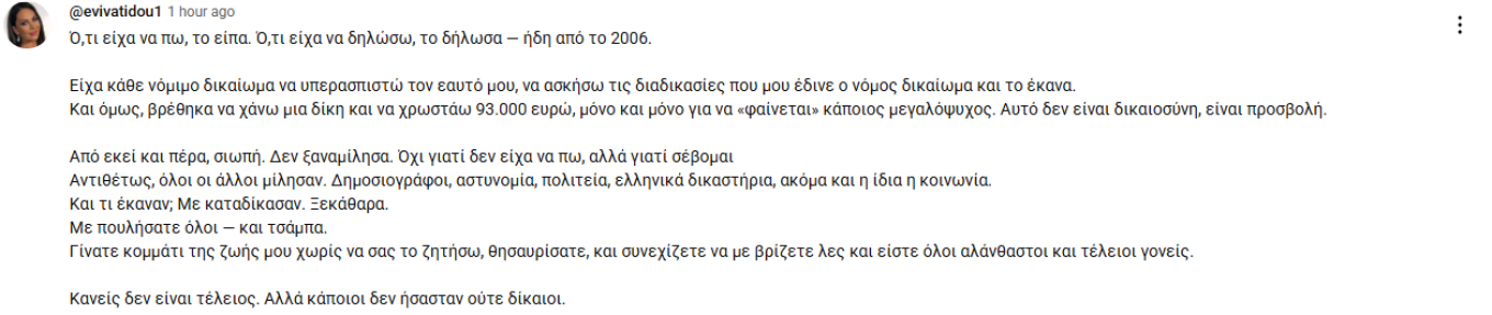 Σε μία από τις παρεμβάσεις της, η Εύη Βατίδου έγραψε: «Ό,τι είχα να πω, το είπα. Ό,τι είχα να δηλώσω, το δήλωσα, ήδη από το 2006. Είχα κάθε νόμιμο δικαίωμα να υπερασπιστώ τον εαυτό μου, να ασκήσω τις διαδικασίες που μου έδινε ο νόμος δικαίωμα και το έκανα. Και όμως, βρέθηκα να χάνω μια δίκη και να χρωστάω 93.000 ευρώ, μόνο και μόνο για να “φαίνεται” κάποιος μεγαλόψυχος. Αυτό δεν είναι δικαιοσύνη, είναι προσβολή. Από εκεί και πέρα, σιωπή. Δεν ξαναμίλησα. Όχι γιατί δεν είχα να πω, αλλά γιατί σέβομαι. Αντιθέτως, όλοι οι άλλοι μίλησαν. Δημοσιογράφοι, αστυνομία, πολιτεία, ελληνικά δικαστήρια, ακόμα και η ίδια η κοινωνία. Και τι έκαναν; Με καταδίκασαν. Ξεκάθαρα. Με πουλήσατε όλοι και τσάμπα. Γίνατε κομμάτι της ζωής μου χωρίς να σας το ζητήσω, θησαυρίσατε, και συνεχίζετε να με βρίζετε λες και είστε όλοι αλάνθαστοι και τέλειοι γονείς».