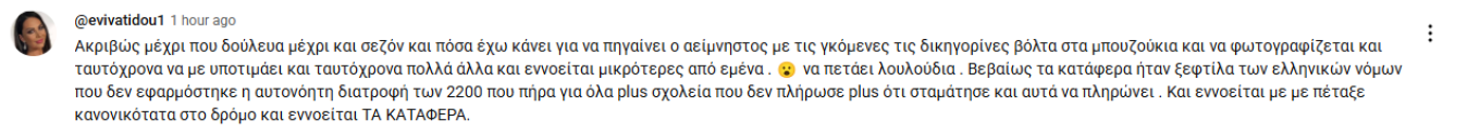 Στη συνέχεια, με δεύτερο σχόλιό της, τοποθετήθηκε ακόμα πιο αιχμηρά, τονίζοντας: «Ακριβώς. Μέχρι που δούλευα και σεζόν και πόσα έχω κάνει για να πηγαίνει ο αείμνηστος με τις γκόμενες τις δικηγορίνες βόλτα στα μπουζούκια και να φωτογραφίζεται και ταυτόχρονα να με υποτιμάει και ταυτόχρονα πολλά άλλα, και εννοείται μικρότερες από εμένα, να πετάει λουλούδια… Βεβαίως τα κατάφερα. Ήταν ξεφτίλα των ελληνικών νόμων που δεν εφαρμόστηκε η αυτονόητη διατροφή των 2200 που πήρα για όλα, plus σχολεία που δεν πλήρωσε, plus ότι σταμάτησε και αυτά να πληρώνει. Και εννοείται με πέταξε κανονικότατα στο δρόμο και εννοείται τα κατάφερα».