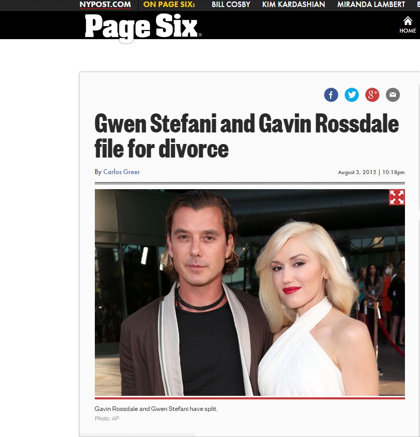 Έπειτα από 13 χρόνια γάμου η Γκουέν Στεφάνι και ο Γκάβιν Ρόσντεϊλ αποφάσισαν να τραβήξουν χωριστούς δρόμους, σύμφωνα με την New York Post.