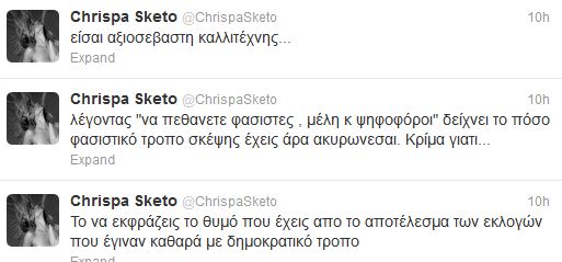 Συγκεκριμένα, η Μποφίλιου είχε γράψει: “Κτήνη, αλήτες, σας δόθηκε και σημασία.Να πεθάνετε φασίστες, μέλη και ψηφοφόροι, προς ένδειξη σεβασμού στην ανθρώπινη αξιοπρέπεια. Να μην ξεχάσω πώς η αποδοχή της φρίκης σαν κάτι αμετάκλητο, είναι η μισή συνενοχή στο έγκλημα”Αυτή η ανάρτηση έκανε τη Χρύσπα, να σχολιάσει οργισμένα στο δικό της λογαριασμό, στο twitter…