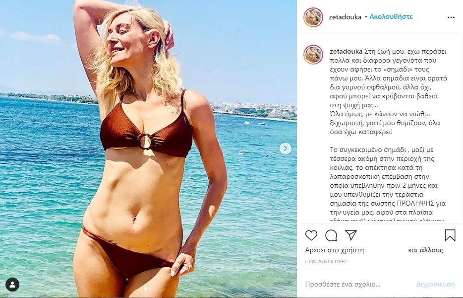 Για το πόσο ξεχωριστή την κάνουν να αισθάνεται τα σημάδια της καθώς της θυμίζουν όλα όσα έχει καταφέρει, έγραψε σε ανάρτησή της στο instagram η Ζέτα Δούκα η οποία ποζάρει με μπικίνι και δείχνει ιδίως το σημάδι στην κοιλιά της. Όπως σημειώνει η γνωστή ηθοποιός, αυτό το σημάδι το απέκτησε κατά τη λαπαροσκοπική επέμβαση στην οποία υπεβλήθη πριν από δύο μήνες και υπογραμμίζει την τεράστια σημασία της σωστής πρόληψης για την υγεία μας καθώς παραλίγο να υποστεί ολική υστερεκτομή.