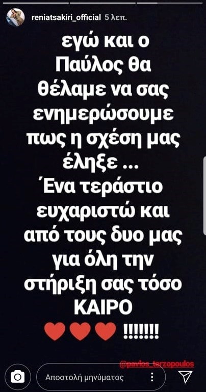 “Εγώ και ο Παύλος θα θέλαμε να σας ενημερώσουμε πως η σχέση μας έληξε. Ένα τεράστιο ευχαριστώ και από τους δυο μας για όλη τη στήριξη σας τόσο καιρό!!!”, έγραψε η Ρένια Τσακίρη.