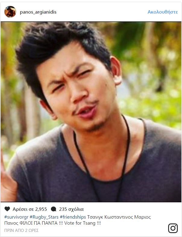 Ο Πάνος Αργιανίδης μπορεί να έχει αποχωρήσει από το Survivor, αλλά παραμένει φανατικός τηλεθεατής του παιχνιδιού.Έτσι μετά τη χθεσινή ψηφοφορία στο συμβούλιο του νησιού που έφερε τους Σπαλιάρα, Ελισάβετ και Τσανγκ να είναι οι τρεις πρώτοι υποψήφιοι προς αποχώρηση από το Survivor μετά την ένωση των δύο ομάδων, έσπευσε να κάνει δήλωση-στήριξης για τον τελευταίο. Ο μάνατζερ ράγκμπι ανέβασε στο instagram την φωτογραφία του Τσανγκ, ο οποίος ήταν ο κολλητός του φίλος στο παιχνίδι, γράφοντας: «Τσανγκ Κωσταντίνος Μάριος Πάνος ΦΙΛΟΙ ΓΙΑ ΠΑΝΤΑ !!! Vote for Tsang». Δείτε την ανάρτηση στο Instagram: