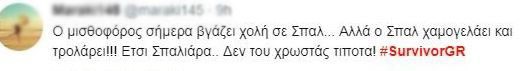 Ο πρώην μισθοφόρος, ξέσπασε κατά του «Σπαλ» γιατί θεωρούσε πως υποστήριζε τον Ντάνο στα αγωνίσματα. Όπως ήταν αναμενόμενο, στο twitter η συγκεκριμένη κίνηση δεν πέρασε απαρατήρητη, αλλά σχολιάστηκε ποικιλοτρόπως.