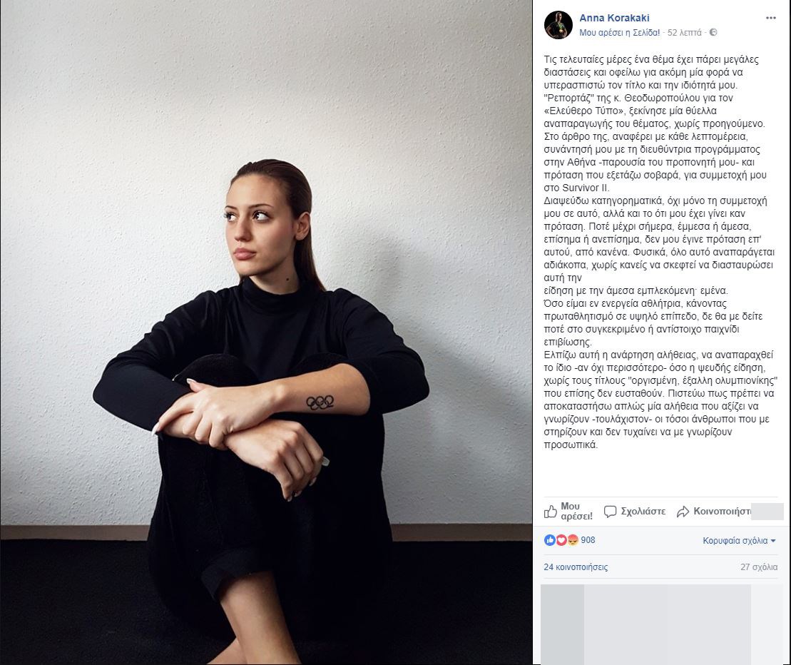 “Τις τελευταίες μέρες ένα θέμα έχει πάρει μεγάλες διαστάσεις και οφείλω για ακόμη μία φορά να υπερασπιστώ τον τίτλο και την ιδιότητά μου. “Ρεπορτάζ” της κ. Θεοδωροπούλου για τον «Ελεύθερο Τύπο», ξεκίνησε μία θύελλα αναπαραγωγής του θέματος, χωρίς προηγούμενο. Στο άρθρο της, αναφέρει με κάθε λεπτομέρεια, συνάντησή μου με τη διευθύντρια προγράμματος στην Αθήνα -παρουσία του προπονητή μου- και πρόταση που εξετάζω σοβαρά, για συμμετοχή μου στο Survivor ΙΙ. Διαψεύδω κατηγορηματικά, όχι μόνο τη συμμετοχή μου σε αυτό, αλλά και το ότι μου έχει γίνει καν πρόταση. Ποτέ μέχρι σήμερα, έμμεσα ή άμεσα, επίσημα ή ανεπίσημα, δεν μου έγινε πρόταση επ’ αυτού, από κανένα. Φυσικά, όλο αυτό αναπαράγεται αδιάκοπα, χωρίς κανείς να σκεφτεί να διασταυρώσει αυτή την είδηση με την άμεσα εμπλεκόμενη· εμένα. Όσο είμαι εν ενεργεία αθλήτρια, κάνοντας πρωταθλητισμό σε υψηλό επίπεδο, δε θα με δείτε ποτέ στο συγκεκριμένο ή αντίστοιχο παιχνίδι επιβίωσης. Ελπίζω αυτή η ανάρτηση αλήθειας, να αναπαραχθεί το ίδιο -αν όχι περισσότερο- όσο η ψευδής είδηση, χωρίς τους τίτλους “οργισμένη, έξαλλη ολυμπιονίκης” που επίσης δεν ευσταθούν. Πιστεύω πως πρέπει να αποκαταστήσω απλώς μία αλήθεια που αξίζει να γνωρίζουν -τουλάχιστον- οι τόσοι άνθρωποι που με στηρίζουν και δεν τυχαίνει να με γνωρίζουν προσωπικά”, έγραψε χαρακτηριστικά.