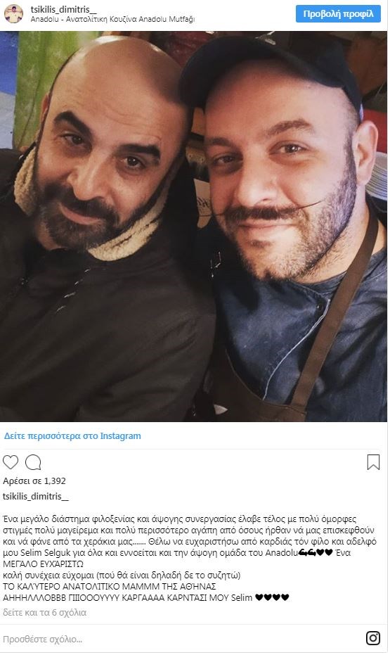 Το Instagram επέλεξε για να ανακοινώσει το τέλος της συνεργασίας τους. Πριν ενάμιση χρόνο, οι δυο τους γνωρίστηκαν στο MasterChefκαι όχι μόνο έγιναν φίλοι αλλά και συνεργάτες.Τώρα, ήρθε η στιγμή να σταματήσουν αυτή την συνεργασία, αλλά όχι και τη φιλιά τους.Ο λόγος για τον Δημήτρη Τσίκιλη και τον Σελίμ.Δείτε την ανάρτηση του Δημήτρη στο instagram:«Ένα μεγάλο διάστημα φιλοξενίας και άψογης συνεργασίας έλαβε τέλος με πολύ όμορφες στιγμές πολύ μαγείρεμα και πολύ περισσότερο αγάπη από όσους ήρθαν νά μας επισκεφθούν και νά φάνε από τα χεράκια μας……. Θέλω να ευχαριστήσω από καρδιάς τόν φίλο και αδελφό μου Selim Selguk για όλα και εννοείται και την άψογη ομάδα του Anadolu ❤️❤️ Ένα ΜΕΓΆΛΟ ΕΥΧΆΡΙΣΤΩ καλή συνέχεια εύχομαι (πού θά είναι δηλαδή δε το συζητώ) ΤΌ ΚΑΛΎΤΕΡΟ ΑΝΑΤΟΛΊΤΙΚΟ ΜΑΜΜΜ ΤΗΣ ΑΘΉΝΑΣΑΗΗΗΛΛΛΟΒΒΒ ΓΙΙΙΟΟΟΥΥΥΥ ΚΑΡΓΑΑΑΑ ΚΑΡΝΤΆΣΙ ΜΟΥ Selim ❤️❤️❤️❤️”, έγραψε ο Δημήτρης Τσίκιλης και ο Σελίμ τον ευχαρίστησε δημόσια στα σχόλια.» έγραψε ο ο Δημήτρης Τσίκιλης κάτω από την φωτογραφία και ο Σελίμ τον ευχαρίστησε για όλα.Από το δημόσιο μήνυμα μπορεί ν’ αντιληφθεί κανείς πώς οι δυο τους δεν τσακώθηκαν, απλά ο Δημήτρης θεώρησε πώς ήρθε η στιγμή να κάνει επαγγελματικές αλλαγές.