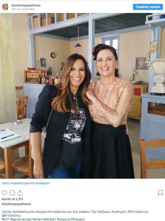 Η Έλλη Κοκκίνου βρέθηκε το πρωί της Πέμπτης καλεσμένη στο «Πρωινό» και αμέσως μετά το τέλος της εκπομπής εκμεταλλεύτηκε την ευκαιρία για μία γρήγορη επίσκεψη στο πλατό-χωριό που έχει στηθεί δίπλα στα Kappa Studios και γυρίζονται πολλές σκηνές από τις «Άγριες Μέλισσες».Η γνωστή τραγουδίστρια συναντήθηκε με τη Θεοφανία Παπαθωμά, τη Βιολέττα της σειράς και φωτογραφήθηκαν μαζί με την ηθοποιό να αναφέρει: «Υψηλοί προσκεκλημένοι σήμερα στο καφενείο μου στο Διαφάνι! Όχι παίζουμε. Αγαπημένη Έλλη Κοκκίνου».Δείτε τη φωτογραφία:
