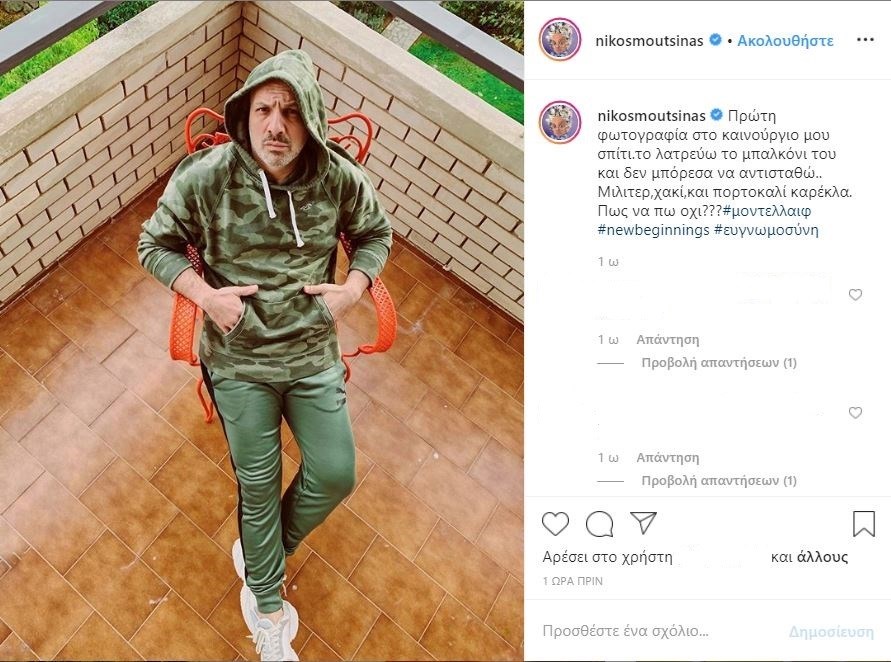 Στο μπαλκόνι ποζάρει ο Νίκος Μουτσινάς για την πρώτη του φωτογραφία από το καινούργιο του σπίτι.