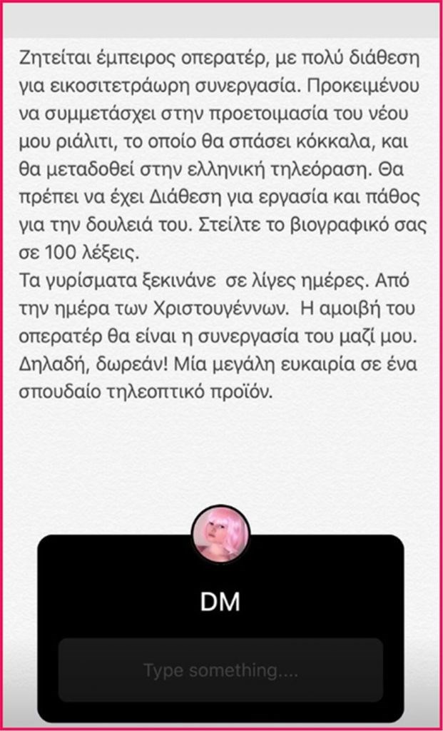 Το μοντέλο μέσω insta story, ανακοίνωσε ότι ετοιμάζει το δικό της reality που θα σπάσει κόκαλα και γι’ αυτό αναζητεί συνεργάτες. Ωστόσο, ίσως υπάρξει ένα πρόβλημα με την αμοιβή καθώς αυτή θα είναι… δωρεάν και η ανταμοιβή η συνεργασία με την ίδια, όπως χαρακτηριστικά γράφει στην αγγελία εργασίας που ανήρτησε στο instagram.