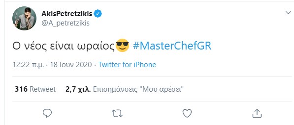 “Ο νέος είναι ωραίος”, έγραψε χαρακτηριστικά ο επιτυχημένος μάγειρας στο προφίλ του στο twitter εκφράζοντας με αυτόν τον τρόπο τη στήριξή του στον φετινό νικητή του MasterChef.