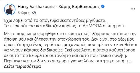 Όπως αναφέρει ο Χάρης Βαρθακούρης “καταδικάζω με κάθε τρόπο τέτοιου είδους λόγια και συμπεριφορές” ενώ προσέθεσε μεταξύ άλλων ότι “δεν μπορώ να απολογηθώ για λόγια και πράξεις άλλων, το μόνο που μπορώ να κάνω είναι να απολογηθώ για την αργοπορημένη, από πλευράς μου, δημόσια αντίδραση και ανταπόκριση”. Ολόκληρη η ανάρτησή του αναφέρει τα εξής: