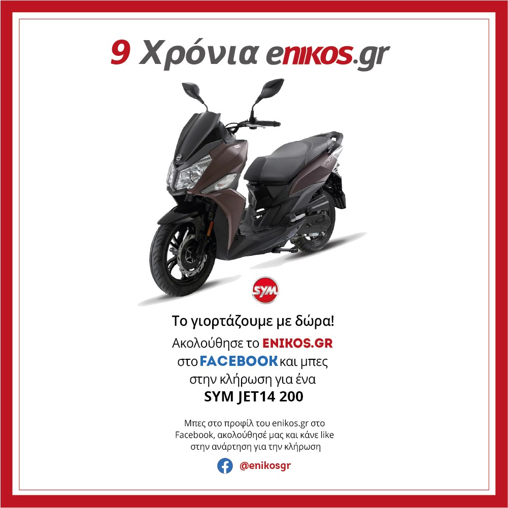 Το enikos.gr συμπληρώνει εννέα χρόνια ζωής και το γιορτάζει με ένα μεγάλο δώρο για τους αναγνώστες του. Ακολούθησε το enikos.gr στο Facebook και μπες στην κλήρωση για ένα σκούτερ SYM JET14 200, σε χρώμα MAT BROWN.