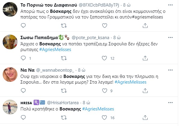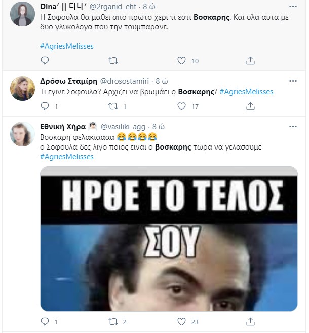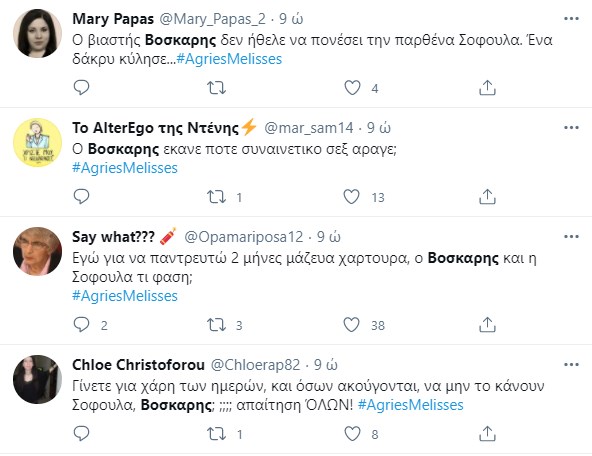 Οι “Άγριες Μέλισσες” χθες συγκλόνισαν. Μια σκηνή που προκάλεσε καυστικά σχόλια στο Twitter ήταν αυτή της πρώτης νύχτας του γάμου της Σοφούλας με τον Βόσκαρη. Παρά το γεγονός ότι όλο το Διαφάνι προσπαθούσε να προστατέψει τη Σοφούλα από τα νύχια του βασανιστή της Ελένης, εκείνη δεν άκουσε κανέναν. Το ζευγάρι παντρεύτηκε μυστικά στο γειτονικό χωριό.