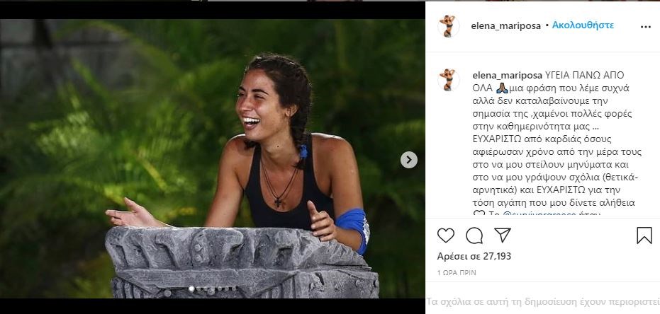 «ΥΓΕΙΑ ΠΑΝΩ ΑΠΟ ΟΛΑ μια φράση που λεμέ συχνά αλλά δεν καταλαβαίνουμε την σημασία της, χαμένοι πολλές φορές στην καθημερινότητα μας … ΕΥΧΑΡΙΣΤΩ από καρδίας όσους αφιέρωσαν χρόνο από τη μέρα τους στο να μου στείλουν μηνύματα και στο να μου γράψουν σχόλια (θετικά-αρνητικά) και ΕΥΧΑΡΙΣΤΩ για την τόση αγάπη που μου δίνετε αλήθεια. Το Survivor ήταν πραγματικά μια μοναδική εμπειρία που είχα την τύχη να ζήσω και κρατάω μόνο τα θετικά αλλά δυστυχώς έπρεπε να ακούσω το σώμα μου που υπέφερε και αποχώρησα . Δεν θέλω να σταθώ σε σωστά και λάθη γιατί αυτά, συμβαίνουν παντού́ και πάντα . Αυτό που έχει σημασία είναι η κάθε εμπειρία να μας διδάσκει και να γινόμαστε καλύτεροι από ότι ήμασταν πριν. Και αυτό έγινε ! Στο παιχνίδι έμαθα να εκτιμώ την υγεία , το σπίτι , το φαγητό και τους ανθρώπους μου . Και μην ξεχνάτε : ΟΙ ΠΡΑΓΜΑΤΙΚΟΙ SURVIVORS ΕΙΣΑΣΤΕ ΟΛΟΙ ΕΣΕΙΣ . Όλοι όσοι παλεύετε με προβλήματα υγείας και τα ξεπερνάτε, όλοι οι βιοπαλαιστές που κοπιάζετε να πάτε φαγητό στο σπίτι σας και σε γενικότερο επίπεδο όσοι ζείτε δυσκολίες και δεν τα παρατάτε ΠΟΤΕ ! Εμείς είμαστε απλώς παίκτες ενός reality … Τα καλύτερα τώρα έρχονται (για όλους ) πιστέψτε το !