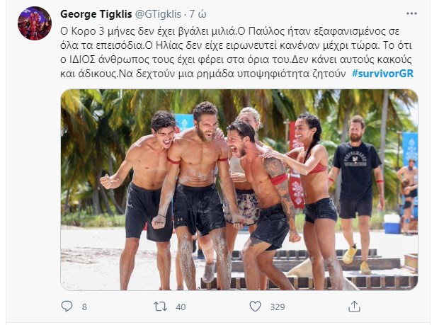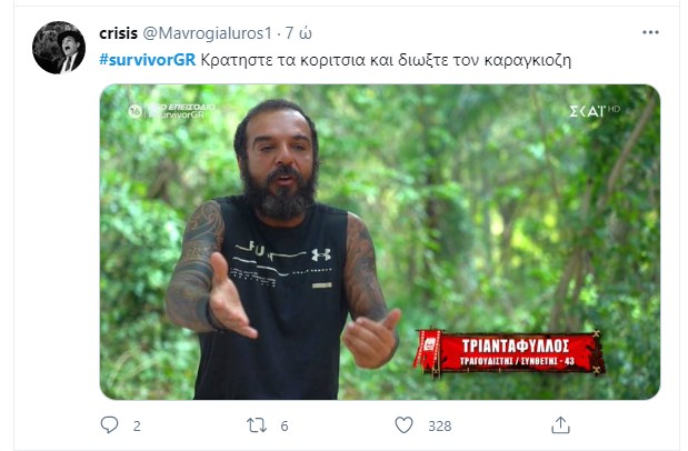 Οι χρήστες του Twitter υποστηρίζουν την άμεση αποχώρηση του Τριαντάφυλλου, ο οποίος βρήκε έναν σύμμαχο στο πρόσωπο του Αλέξη Παππά, αλλά προκλητικά κάλεσε όποιον από τους συμπαίκτες του τολμά να τον αντιμετωπίσει στον… τάκο. Όπως φαίνεται, το γεγονός ότι μέχρι στιγμής οι τηλεθεατές τον έχουν κρατήσει στο ριάλιτι όσες φορές βρέθηκε υποψήφιος, έχει “φουσκώσει” την αυτοπεποίθηση του τραγουδιστή.