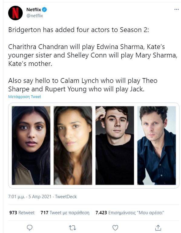 Μπορεί οι εκατομμύρια ανά τον κόσμο θαυμάστριες τουΡέγκε Ζαν Πέιτζ να απογοητεύτηκαν για την αποχώρησή του από τη σειρά Μπρίτζερτον, όμως η παραγωγή ανακοίνωσε τέσσερις νέους ηθοποιούς καθώς ετοιμάζεται ο δεύτερος κύκλος. Οι Charithra Chandran, Shelley Conn, Calam Lynch και Rupert Young επιβεβαιώθηκαν ως τα νέα πρόσωπα της σειράς του Netflix.