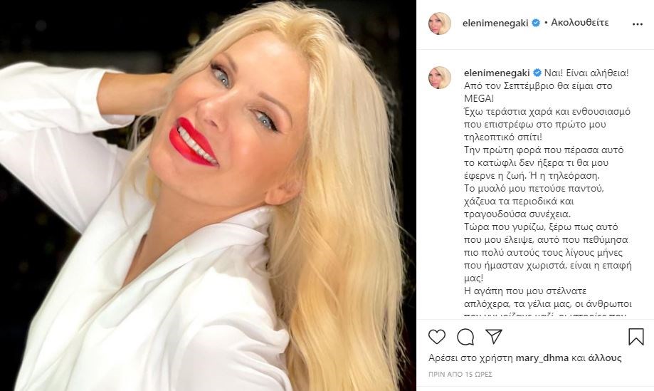 “Ναι! Είναι αλήθεια! Από τον Σεπτέμβριο θα είμαι στο MEGA! Έχω τεράστια χαρά και ενθουσιασμό που επιστρέφω στο πρώτο μου τηλεοπτικό σπίτι! Την πρώτη φορά που πέρασα αυτό το κατώφλι δεν ήξερα τι θα μου έφερνε η ζωή. Ή η τηλεόραση. Το μυαλό μου πετούσε παντού, χάζευα τα περιοδικά και τραγουδούσα συνέχεια. Τώρα που γυρίζω, ξέρω πως αυτό που μου έλειψε, αυτό που πεθύμησα πιο πολύ αυτούς τους λίγους μήνες που ήμασταν χωριστά, είναι η επαφή μας! Η αγάπη που μου στέλνατε απλόχερα, τα γέλια μας, οι άνθρωποι που γνωρίζαμε μαζί, οι ιστορίες που μοιραζόμασταν, τα χρόνια που μεγαλώναμε παρέα. Αυτά θέλω να ξαναβρούμε με νέους τρόπους ή με παλιούς, δεν έχει σημασία… το σημαντικό είναι να είμαστε μαζί και εγώ υπόσχομαι να είμαι πάντα η Ελένη σας, η φίλη που σας χαμογελάει και σας δείχνει την αισιόδοξη πλευρά της ζωής! Στο MEGA! Όλα αρχίζουν ξανά…”, έγραψε η Ελένη Μενεγάκη.