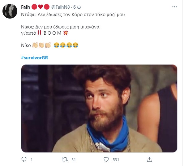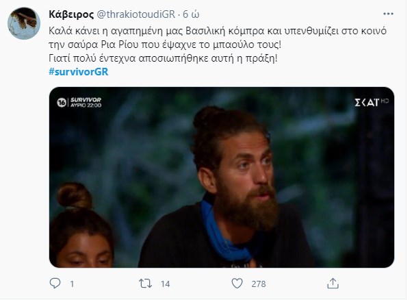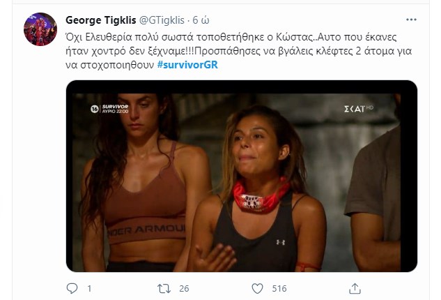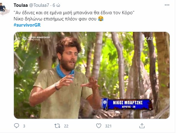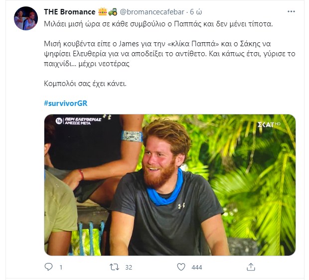 «Να! Με έγραψε… Από τη μία πέρασε και από την άλλη βγήκε» πρόσθεσε ο ηθοποιός στο Survivor. «Μου λέει θα το φέρει σε πέντε λεπτά και έχουν περάσει σχεδόν δυο ώρες. Πουθενά η ψησταριά! Αυτά, τώρα, είναι μπούρδες. Σόρρυ, Τζέιμς, αλλά αν είσαι εσύ μια φορά πουτ@ν@, εγώ είμαι δέκα» είπε ο Αλέξης Παππάς.