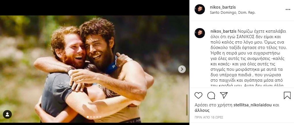 “Νομίζω έχετε καταλάβει όλοι ότι εγώ ΣΑΝΙΚΟΣ δεν είμαι και πολύ καλός στο λόγο μου. Όμως ένα δύσκολο ταξίδι έφτασε στο τέλος του. Ήρθε η σειρά μου να ευχαριστήσω για όλες αυτές τις αναμνήσεις -καλές και κακές- και για όλες αυτές τις στιγμές που μοιράστηκα με αυτά τα δυο υπέροχα παιδιά , που γνώρισα στο παιχνίδι και αγάπησα μέσα από την καρδιά μου. Αυτή δεν είναι άλλη φυσικά, από την @amiyiami ,που από την πρώτη στιγμή που ήρθε στην ομάδα μας κολλήσαμε και είναι από τις μόνες παίκτριες που κράτησε τον χαρακτήρα της και τα πιστεύω της, χωρίς να κάνει καμία κωλοτούμπα κοιτώντας το συμφέρον της. Και φυσικά τον μεγαλύτερο τσοπανοτραβόλτα της Ρόδου, τον @jamie.kaf . Πραγματικά τι να πω για αυτόν τον άνθρωπο. Νομίζω τα είπα όλα στο συμβούλιο αποχώρησης του. Bro είσαι ο,τι καλύτερο γνώρισα στο survivor. Δέσαμε από την πρώτη στιγμή που πατήσαμε το πόδι μας στο νησί. Αυτά που περάσαμε μέσα στο παιχνίδι νομίζω θα μας δένουν για πάντα. Τέλος θέλω να ευχαριστήσω μέσα από την καρδιά μου όλους εσάς που μας στηρίξατε και μας αγαπήσατε. Υγ. Τελικά το έπαθλο το νίκησα και με το παραπάνω. Εκτός από αυτά τα δυο υπέροχα παιδιά, κέρδισα και την ζέστη αγκαλιά όλων όσων με στήριξαν. Πιστέψτε με αυτό αξίζει πολλά περισσότερα από ένα χρηματικό έπαθλο. Σας ευχαριστώ όλους από τα βάθη της καρδιάς μου.