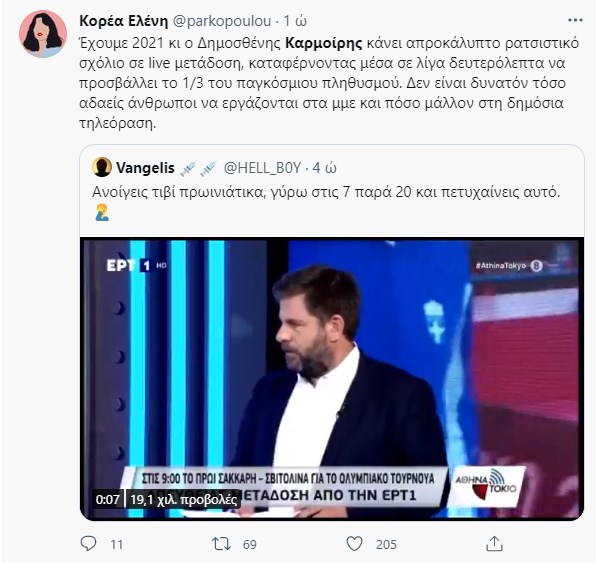 Με ένα λιτό δελτίο Τύπου, η ΕΡΤ ανακοίνωσε τη λήξη της συνεργασίας με τον αθλητικό δημοσιογράφο, Δημοσθένη Καρμοίρη. “Ρατσιστικά σχόλια δεν χωρούν στη Δημόσια τηλεόραση. Η συνεργασία του Δημοσθένη Καρμοίρη με την ΕΡΤ παύθηκε σήμερα, αμέσως μετά την πρωινή εκπομπή της ΕΡΤ1” αναφέρει. Υπενθυμίζεται ότι σήμερα νωρίς το πρωί ο δημοσιογράφος στην εκπομπή του Δημήτρη Κοτταρίδη έκανε ένα ρατσιστικό σχόλιο αναφερόμενος στην ομάδα Πινγκ Πονγκ της Νότιας Κορέας. “Οι Κορεάτες δεν παίζονται στο πινγκ πονγκ. Επειδή είναι σχιστά τα μάτια πώς παρακολουθούν το μπαλάκι που πάει και έρχεται;”, στη συνέχεια και οι δύο γέλασαν πριν πάνε στο επόμενο θέμα.