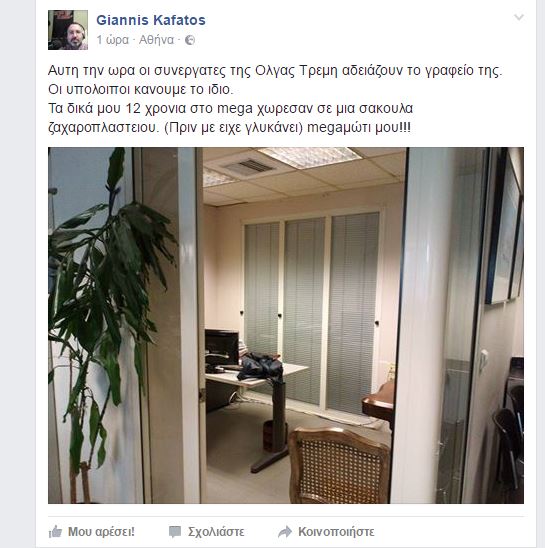 «Αυτή την ώρα οι συνεργάτες της Όλγας Τρέμη αδειάζουν το γραφείο της. Οι υπόλοιποι κάνουμε το ίδιο. Τα δικά μου 12 χρονια στο mega χώρεσαν σε μια σακούλα ζαχαροπλαστείου. (Πριν με είχε γλυκάνει) megaμώτι μου!!!»
