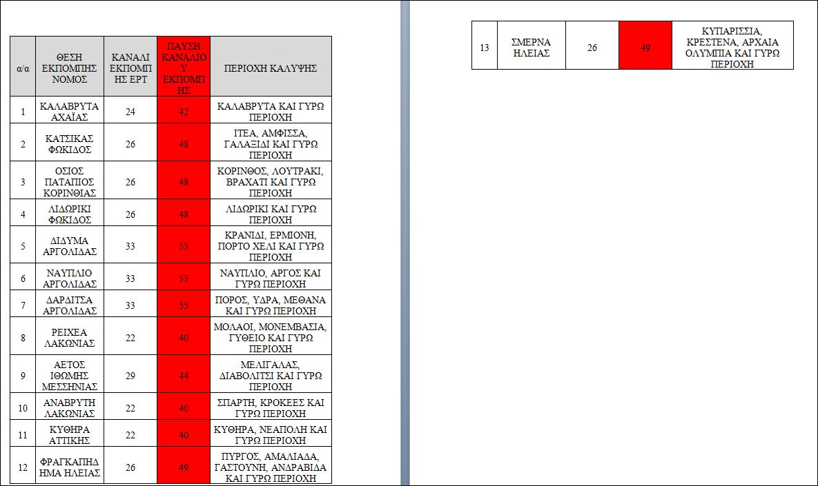 Στον παρακάτω πίνακα αναφέρονται τα σημεία αυτά και τα αντίστοιχα κανάλια εκπομπής του τηλεοπτικού σήματος της ΕΡΤ αλλά και τα κανάλια των οποίων θα παύσει η λειτουργία.