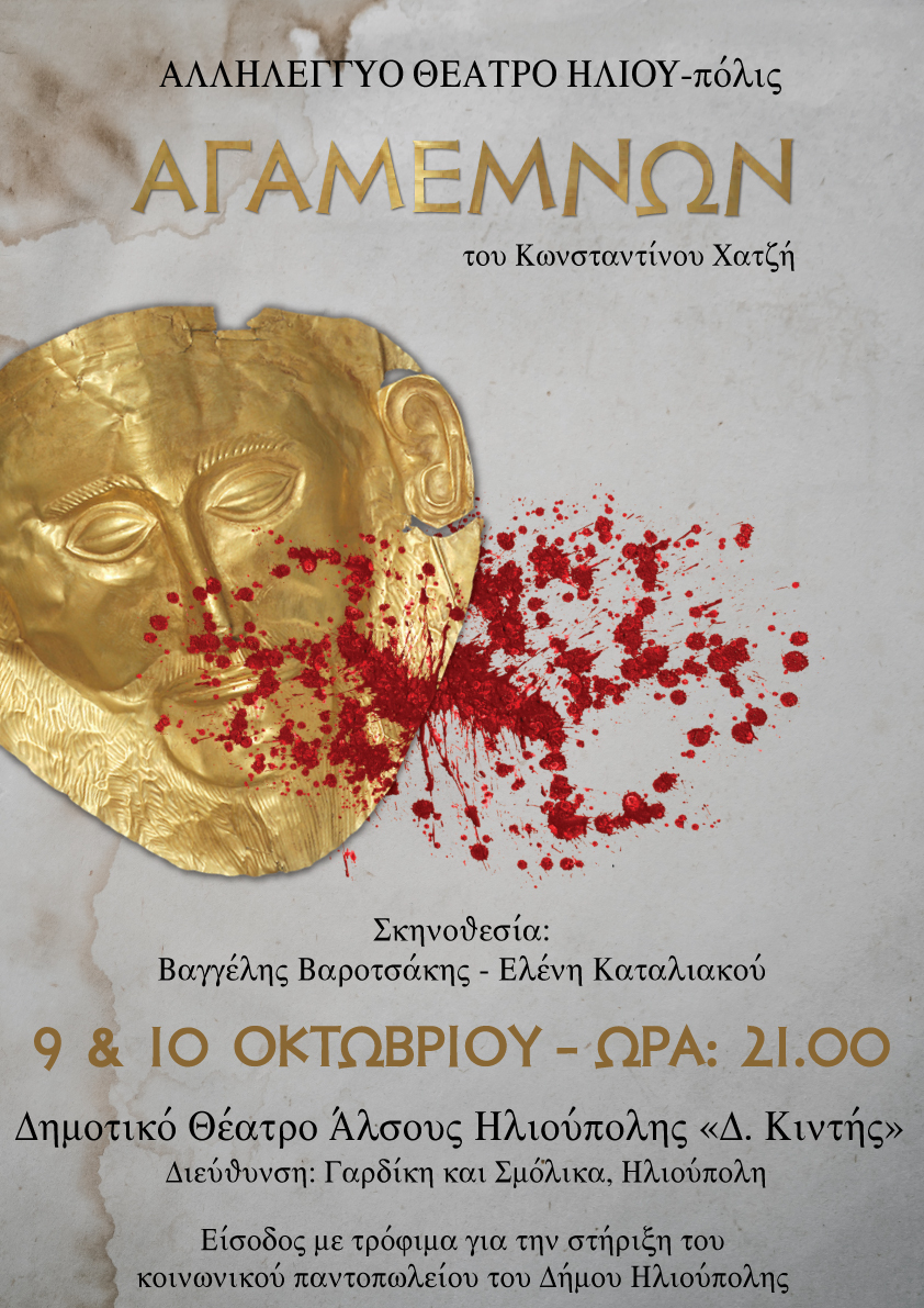 Στις 9 και 10 Οκτωβρίου στο δημοτικό Θέατρο Άλσους Δ. Κιντής θα πραγματοποιηθεί από το Αλληλέγγυο Θέατρο Ηλίου – πόλις, διήμερο παραστάσεων με το θεατρικό έργο “Αγαμέμνων” του Κωνσταντίνου Χατζή.