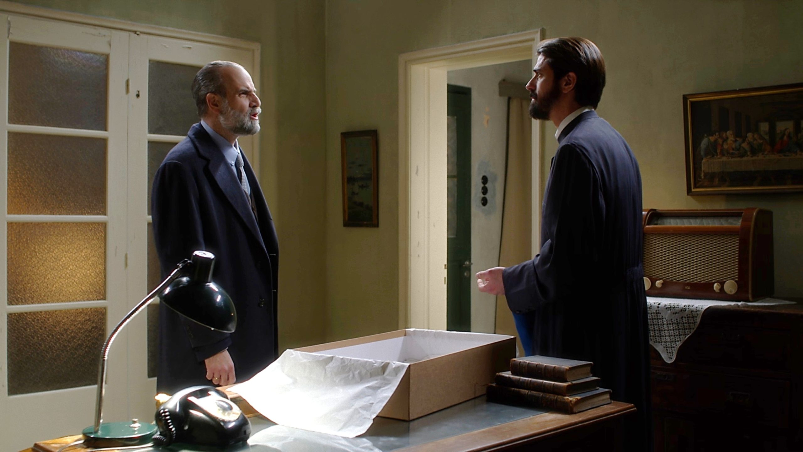 Ο πατήρ Νικόλαος λέει ψέματα στον Παύλο για το φόρεμα της Χλόης που βλέπει στο σπίτι του, επινοώντας μια δικαιολογία.
