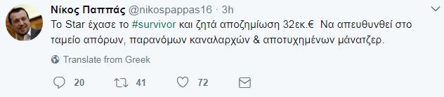 Το Star Channel με αγωγή κατά του Δημοσίου ζητά 32,4 εκατ. ευρώ για να αποκατασταθεί η ζημιά που υπέστη επειδή στον διαγωνισμό για την αδειοδότηση των καναλιών δεν πήρε άδεια και έτσι έχασε το Survivor και μαζί με αυτό τα εκατομμύρια των διαφημιστικών του εσόδων.Συγκεκριμένα, σύμφωνα με την «Εφημερίδα των Συντακτών», στην αγωγή εναντίον του Δημοσίου, και ονομαστικά στο πρόσωπο των σημερινών νόμιμων εκπροσώπων του (δύο υπουργών και του γενικού γραμματέα Ενημέρωσης και Επικοινωνίας), ζητά αποζημίωση πάνω από 30 εκατ. ευρώ «για την αποκατάσταση», όπως αναφέρει χαρακτηριστικά, «της ζημίας που μας προεκλήθη από το γεγονός της συμμετοχής μας και της παράνομης μη αδειοδότησής μας κατά τη διαδικασία του Διαγωνισμού για τη χορήγηση των τεσσάρων τηλεοπτικών αδειών».Το κανάλι διεκδικεί με την αγωγή του συνολικά 32,4 εκατ. ευρώ από τον υπουργό Ψηφιακής Πολιτικής, Τηλεπικοινωνιών και Ενημέρωσης Νίκο Παππά, από τον υπουργό Οικονομικών Ευκλείδη Τσακαλώτο και από τον γενικό γραμματέα Ενημέρωσης και Επικοινωνίας Λευτέρη Κρέτσο.Τα περισσότερα από αυτά τα χρήματα είναι για τη ζημιά που υπέστη το Star Channel, ήτοι 637 χιλ. ευρώ θετική ζημία και 31,7 εκατ. ευρώ αποθετική ζημία, αλλά ζητάει και 100 χιλ. ευρώ επιπλέον για ηθική βλάβη.Ο υπουργός Ψηφιακής Πολιτικής, Τηλεπικοινωνιών και Ενημέρωσης, Νίκος Παππάς, απαντώντας, με ανάρτηση στο Twitter αναφέρει τα εξής: “Το Star έχασε το Survivor και ζητά αποζημίωση 32 εκ. ευρώ. Να απευθυνθεί στο ταμείο απόρων, παρανόμων καναλαρχών και αποτυχημένων μάνατζερ”