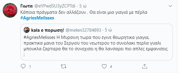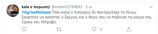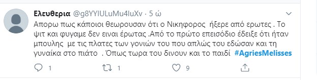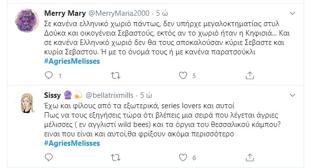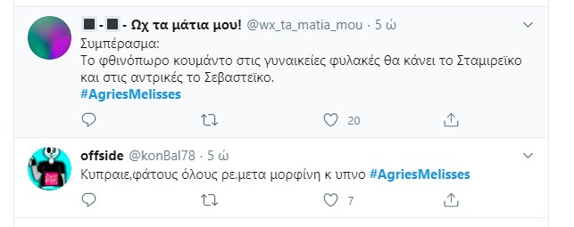 “Πάρτι” έγινε στο Twitter με το χθεσινό επεισόδιο των “Άγριων Μελισσών” , με το οποίο έπεσε η αυλαία για φέτος για το επιτυχημένο σήριαλ εποχής του ΑΝΤ1. Τα σχόλια στο Twitter επικεντρώθηκαν στον Δούκα Σεβαστό, στην Ελένη, στο μωρό της Δρόσως αλλά και στην κατάντια του Κυπραίου. Πολλά ζητήματα έμειναν “ανοιχτά”. Τι θα γίνει με το μυστικό της Ελένης; Τι θα γίνει με τον Νέστορα και όσα ανακάλυψε για τον Κυπραίο; Θα αυτοκτονήσει ο Κυπραίος ή όχι; Τι όνομα θα πάρει το νεογέννητο της Δρόσως; Φυσικά σχολιάστηκαν και όσα έχουν γίνει γνωστά για τον δεύτερο κύκλο και συγκεκριμένα για όσους βρεθούν στη φυλακή. Στον δεύτερο κύκλο της σειράς, θα μεταφερθούμε πέντε χρόνια μετά, στο 1965. Η Ελένη είναι στη φυλακή και η Δρόσω αφού έχει δώσει το παιδί στους Σεβαστούς, έχει φύγει για την Αθήνα για να κάνει καριέρα τραγουδίστριας. Όμως, καταλήγει σε ένα καμπαρέ – οίκο ανοχής στην Τρούμπα, έχοντας αλλάξει όνομα και κρύβοντας από τους πάντες την πραγματική της ταυτότητα. Η Ελένη προσπαθεί χωρίς αποτέλεσμα να την εντοπίσει μέσα από τη φυλακή.