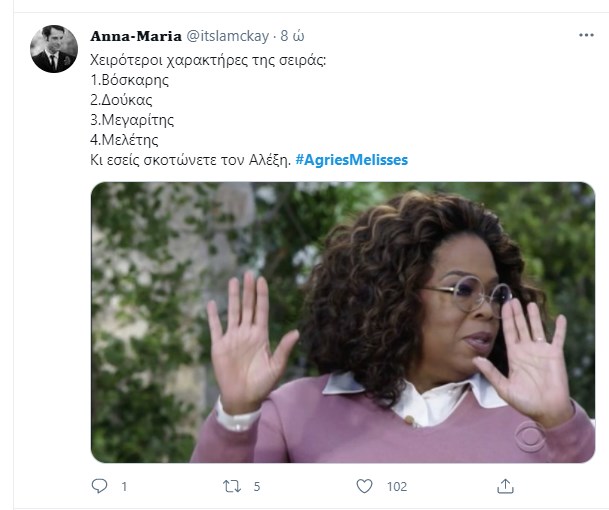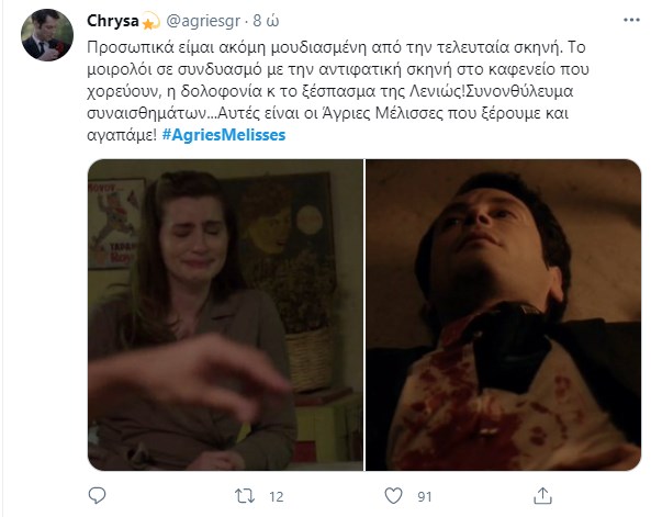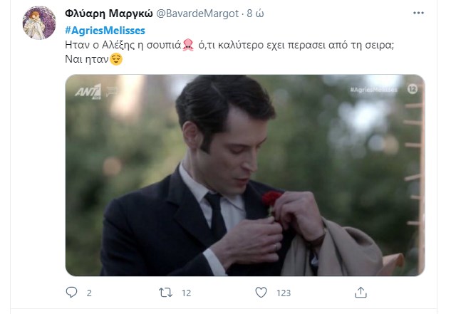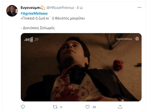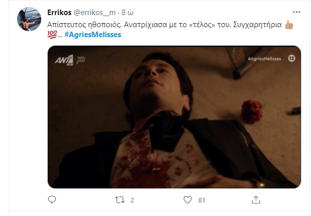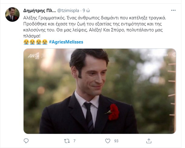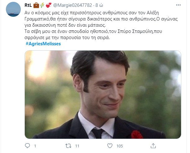 Ο Αλέξης Γραμματικός βρήκε τραγικό θάνατο στο χθεσινό επεισόδιο των “Άγριων Μελισσών”, ανοίγοντας τον “χορό” για το αιματοβαμμένο φινάλε της δεύτερης σεζόν της σειράς που αγάπησε το τηλεοπτικό κοινό. Ο ηθοποιός Σπύρος Σταμούλης συγκλόνισε με την ερμηνεία του στην τελευταία του σκηνή, ενώ η σημειολογία με το κόκκινο γαρύφαλλο που φορούσε στο πέτο σχολιάστηκε εκτενώς στο Twitter. Τα σχόλια των χρηστών έπεσαν “βροχή”, λέγοντας το “αντίο” στον Αλέξη Γραμματικό.