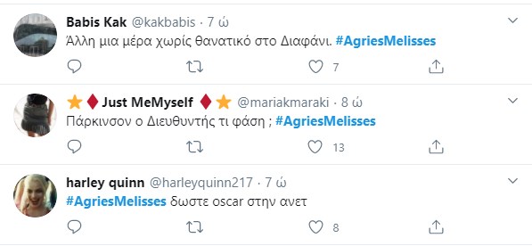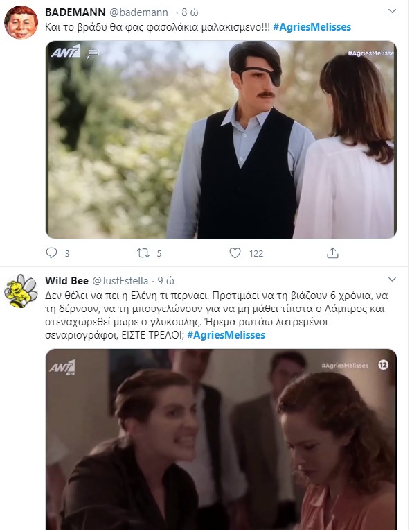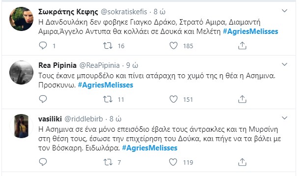 Κάθε βράδυ γίνεται χαμός στοTwitter με το επεισόδιο των “Άγριων Μελισσών“. Με χιούμορ και ευρηματικότητα σχολίασαν τις χθεσινές εξελίξεις. Ενώ ο “Γιάγκος Δράκος” μπήκε και αυτός στο κάδρο των σχολίων λόγω της… Ανέτ. Χθες είδαμε τον Νικηφόρο να παλεύει να αντιμετωπίσει την απεργία των εργατών. Σε αυτή του την προσπάθεια τον βοηθούν η Ασημίνα και η Ανέτ. Ο Λάμπρος αρνείται να δεχτεί τον Νικηφόρο στον Συνεταιρισμό, σεβόμενος την απόφαση των υπόλοιπων μελών. Η Μυρσίνη μαθαίνει πως ο Δούκας ζήτησε να την δει και, παρά τον φόβο της, είναι αποφασισμένη να πάει για να του εξηγήσει. Ο Νέστορας παλεύει με τις τύψεις του και η Βιολέτα απελπίζεται με την κατάσταση του Μιλτιάδη που χειροτερεύει. Μαζί με τον Λάμπρο, θα πρέπει να πάρουν αποφάσεις σχετικά με το μέλλον και τη θεραπεία του Μιλτιάδη. Η Δρόσω δείχνει ενδιαφέρον για την πρόταση συνεργασίας του Τάκη για να γίνει τραγουδίστρια παρότι ο κύριος Ανέστης την αποτρέπει από μια τέτοια εργασία. Η Ελένη βρίσκεται αντιμέτωπη με τη συγκρατούμενή της Χατζίδου, ενώ ο Βόσκαρης συνεχίζει το παιχνίδι του μαζί της αλλά η Ελένη έχει αρχίσει να τον υποψιάζεται.