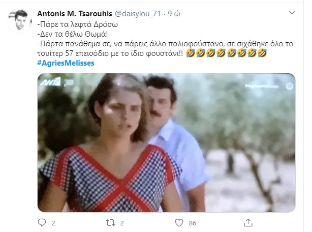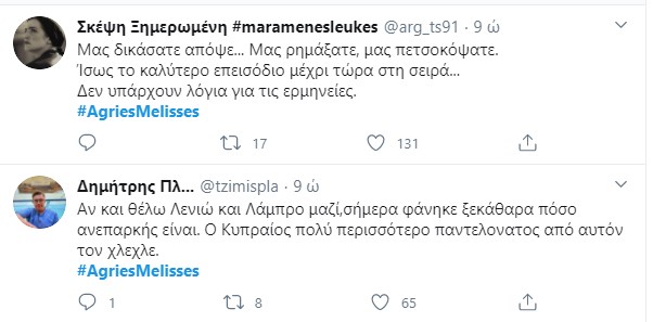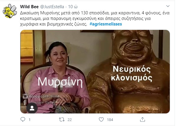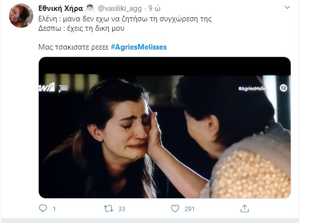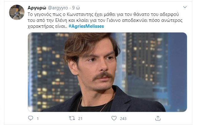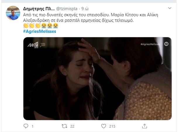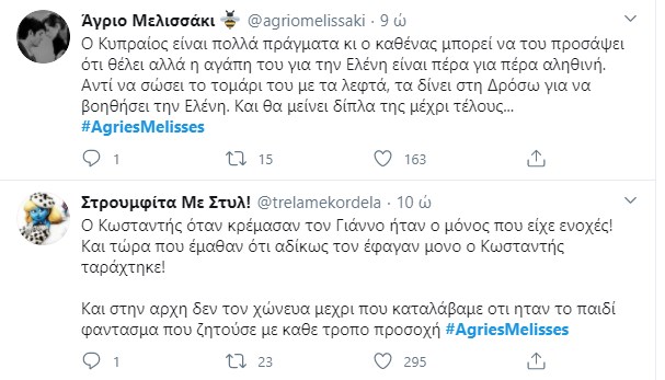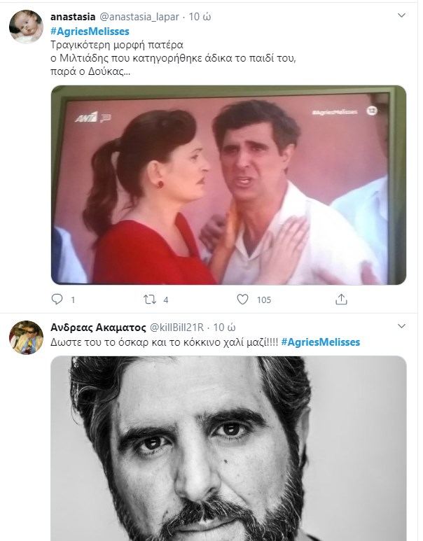 “Πάρτι” έγινε στο Twitter με το χθεσινό επεισόδιο των “Άγριων Μελισσών”. Κανείς δεν μπορεί να πιστέψει το νέο κακό που τους βρήκε, εκτός από τη Μυρσίνη που επιτέλους δικαιώνεται αλλά επιμένει να βάζει στο κάδρο των ενόχων την Ασημίνα και τη Δρόσω. Παρότι ο Νικηφόρος υπερασπίζεται την Ασημίνα, η κρίση στη σχέση τους είναι πια έκδηλη. Ο Μιλτιάδης νιώθει δικαιωμένος που αποκαταστάθηκε το όνομα του Γιάννου αλλά ο λόγος που πήρε μόνος του τη ζωή του, συνεχίζει να είναι αγκάθι μέσα του. Το ίδιο αγκάθι υπάρχει στην ψυχή του Κωνσταντή, που καταρρακώνεται όταν συνειδητοποιεί ότι πήραν άδικα τη ζωή του Γιάννου. Ο Μελέτης, τυφλωμένος από θυμό, αποφασίζει να πάρει τον νόμο στα χέρια του τη μέρα που η Ελένη ετοιμάζεται να μεταφερθεί στον εισαγγελέα. Φυσικά οι χρήστες του Twitter σχολίσαν την αγάπη του Κυπραίου για την Ελένη, αλλά και τις καλύτερες ερμηνείες του επεισόδίου.