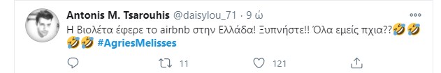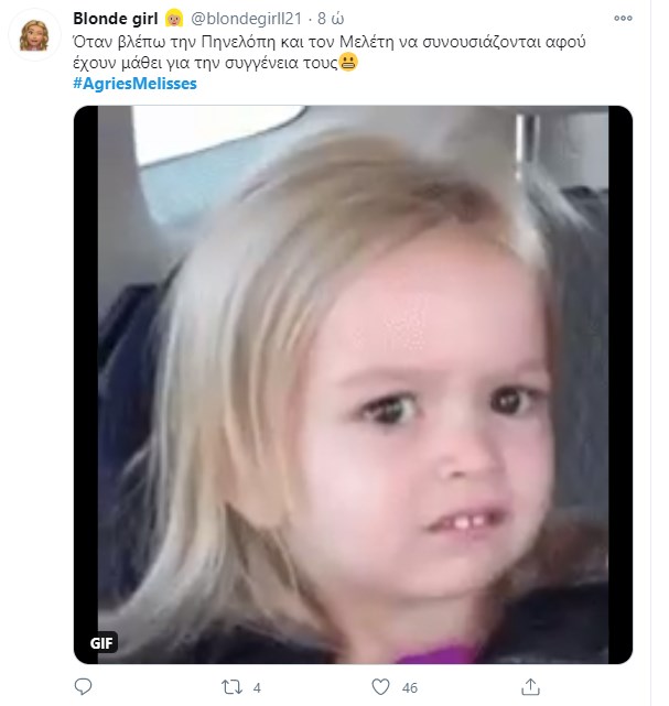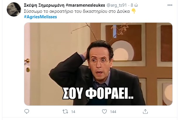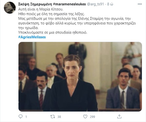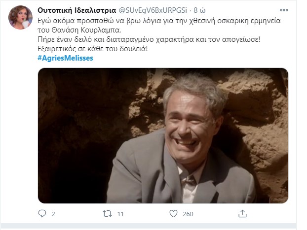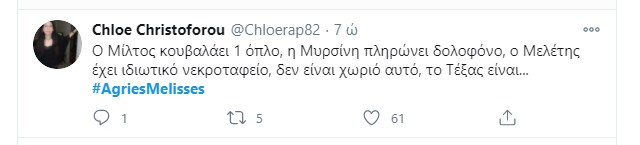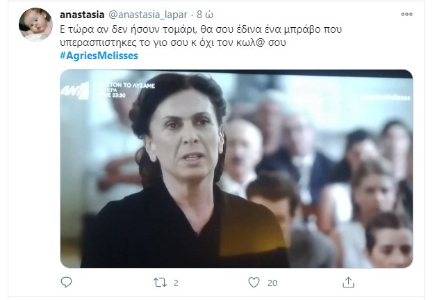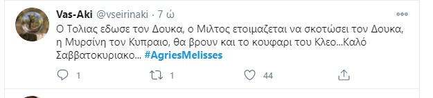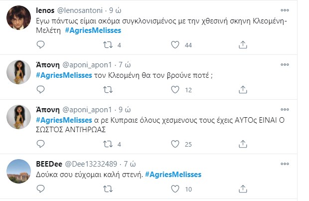 “Πάρτι” έγινε στο Twitter με το χθεσινό επεισόδιο των “Άγριων Μελισσών“. Η Μυρσίνη κατέθεσε, ύστερα από τον εκβιασμό του Κυπραίου, με σκοπό να δώσει περισσότερα ελαφρυντικά στην Ελένη. Τίποτα δεν έχει κριθεί ακόμα και όλοι περιμένουν με αγωνία την απόφαση του δικαστηρίου. Ο Τόλλιας παρουσιάζεται στον εισαγγελέα που έχει αναλάβει την υπόθεση της βιομηχανικής ζώνης, και καταθέτει εναντίον του Δούκα ενώ το ίδιο βράδυ ο Μιλτιάδης αποφασίζει να πάρει τον νόμο στα χέρια του. Το ίδιο συμβαίνει και με τη Μυρσίνη που καταστρώνει ένα ύπουλο σχέδιο κατά της Ελένης, ενώ ο Δούκας πληροφορείται πως η σύλληψη του είναι προ των πυλών… Φυσικά οι χρήστες του Twitter σχολίασαν την απαγορευμένη σχέση Μελέτη – Πηνελόπης και τον φόνο του Κλεομένη από τον εραστή και ξάδελφο της γυναίκας του.
