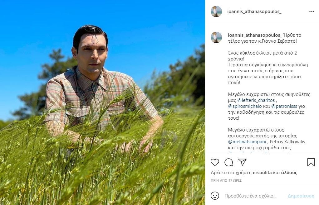 Ολοκληρώθηκε η δεύτερη σεζόν για τις “Άγριες Μέλισσες” με ένα συγκλονιστικό φινάλε, αφήνοντας τους τηλεθεατές με ανυπομονησία για τον τρίτο κύκλο. Ο Ιωάννης Αθανασόπουλος που αν και… “έφυγε” νωρίς ως Γιάννος Σεβαστός, επέστρεφε στη σειρά στη φαντασία του τηλεοπτικού του πατέρα Γιώργου Γάλλου, Μιλτιάδη Σεβαστού, ο οποίος στο ταραγμένο μυαλό του έβλεπε τον αδικοχαμένο γιο του. Πλέον, με το συγκινητικό τέλος του Μιλτιάδη Σεβαστού, ήρθε και το οριστικό τέλος του Γιάννου, και ο Ιωάννης Αθανασόπουλος αποχαιρέτισε τον ήρωά του με ένα μήνυμά του στο instagram: «Ήρθε το τέλος για τον κ. Γιάννο Σεβαστό! Ένας κύκλος έκλεισε μετά από 2 χρόνια!