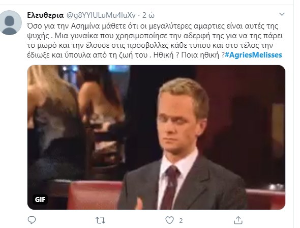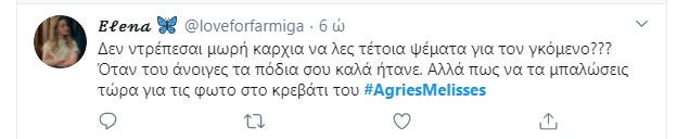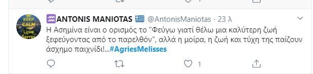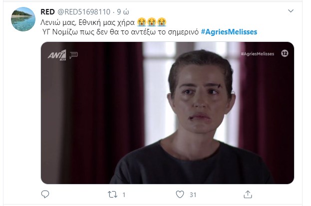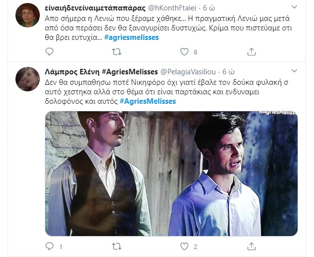 Κάθε βράδυ γίνεται χαμός στοTwitter με το επεισόδιο των “Άγριων Μελισσών“. Οι χθεσινές εξελίξεις στο τελευταίο επεισόδιο της εβδομάδας προκάλεσαν την αντίδραση των χρηστών. Τα θέματα που μονοπώλησαν το ενδιαφέρον ήταν το “είδωλο” όπως αποκάλεσαν την Ασημίνα, η οποία ύψωσε ανάστημα στην οικογένεια Σεβαστών. Η σκηνή όμως που συγκλόνισε ήταν αυτή του βιασμού της Ελένης από τον διευθυντή των φυλακών, Μάνο Βόσκαρη.