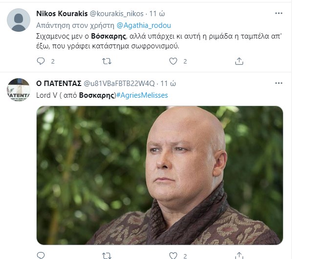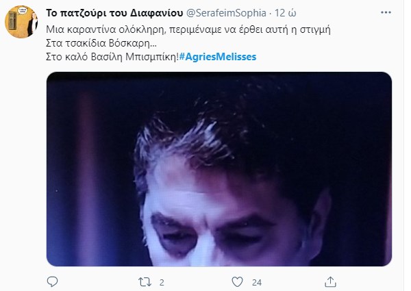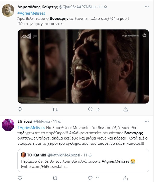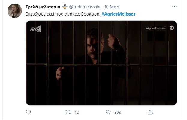Η καταδίκη του Βόσκαρη δικαιώνει τα θύματά του. Ο Βόσκαρης οδηγείται στη φυλακή κι εκεί θα βρεθεί αντιμέτωπος με την πραγματική του τιμωρία… Ο νόμος της φυλακής είναι σκληρός μαζί του και οι συγκρατούμενοι του τον ευνουχίζουν. Η σκληρή σκηνή σχολιάστηκε από τους χρήστες του Twitter, καθώς ήταν αυτή που ξεχώρισε από το χθεσινό επεισόδιο των “Άγριων Μελισσών”.