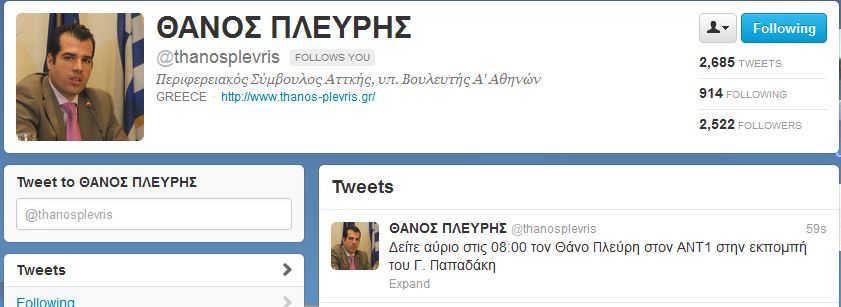 Ο γνωστός πολιτικός “λατρεύει” τον Γιώργο Παπαδάκη τόσο πολύ που τον γύρισε στο πλατό του ΑΝΤ1 μία εβδομάδα νωρίτερα από την προγραμματισμένη έναρξη της εκπομπής. Ο Θάνος Πλεύρης ανακοίνωσε στο twitter ότι το πρωί θα βρίσκεται “στον ΑΝΤ1 στην εκπομπή του Γ.Παπαδάκη”. Και θα το πιστεύαμε αν δεν γνωρίζαμε ότι ο Γιώργος Παπαδάκης επιστρέφει στους τηλεοπτικούς δέκτες, την πρώτη ημέρα του Οκτωβρίου. Αύριο σε “Παπαδάκη” ο Θάνος Πλεύρης θα βρει μόνο τον … Αντώνη που είναι ο αρχισυντάκτης της εκπομπής με τους “καλοκαιρινούς-αντικαταστάτες” παρουσιαστές.