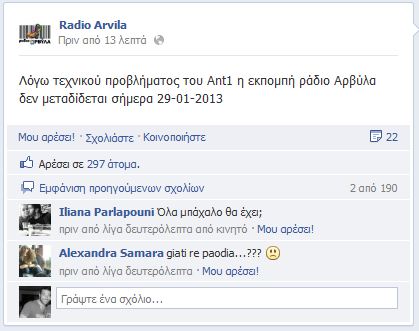 «Λόγω τεχνικού προβλήματος του ΑΝΤ1, η εκπομπή Ράδιο Αρβύλα δεν μεταδίδεται σήμερα 29-01-2013»