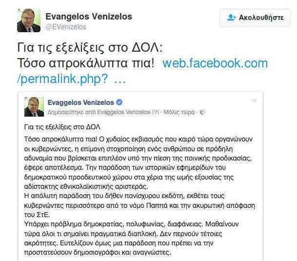 Βενιζέλος: Τόσο απροκάλυπτα πια!