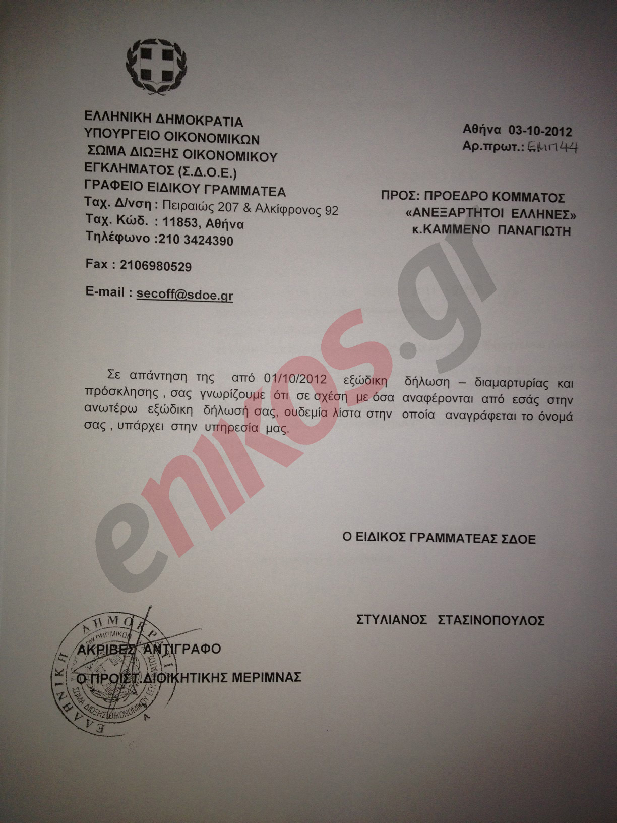 Ο πρόεδρος των Ανεξάρτητων Ελλήνων Πάνος Καμμένος, απαντάει στο δημοσίευμα της εφημερίδας “ΤΑ ΝΕΑ”, με σχετικό έγγραφο που αποστέλλει ο Ειδικός Γραμματέας του ΣΔΟΕ Στυλιανός Στασινόπουλος.