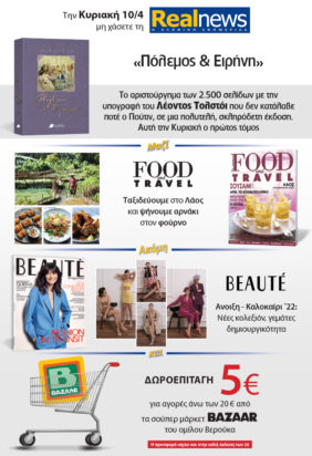 Σήμερα μια μοναδική προσφορά με τη Realnews: «Πόλεμος & Ειρήνη» το αριστούργημα των 2.500 σελίδων με την υπογραφή του Λέοντος Τολστόι σε μια πολυτελή σκληρόδετη έκδοση – Μαζί Food & Travel – Beaute και δωροεπιταγή