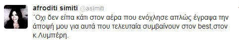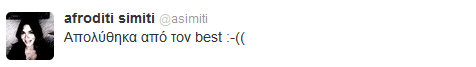 “Απολύθηκα από τον Best”Η Αφροδίτη Σημίτη μετά από συνεργασία μιας δεκαετίας με τον ραδιοφωνικό σταθμό Best, κι έχοντας ταυτίσει το όνομα και τη φωνή της με το σταθμό, απολύθηκε αιφνιδιαστικά μετά το τέλος της εκπομπής της.Ποιό είναι όμως το χρονικό της απόλυσής της;Τον τελευταίο καιρό στο ραδιοφωνικό σταθμό έχουν γίνει μειώσεις αποδοχών κι άλλες περικοπές εξαιτίας της οικονομικής κρίσης.Η Αφροδίτη Σημίτη, θέλοντας να εκφράσει την δυσαρέσκειά της αλλά και τη συμπαράσταση στους συναδέλφους της, έστειλε ένα email στον ιδιοκτήτη του ραδιοφωνικού σταθμού Αντώνη Λυμπέρη, καθώς είχαν μια επαγγελματική σχέση χρόνων κι ως εκ τούτου την αντίστοιχη οικειότητα… ή έτσι νόμιζε.Η αντίδραση ήταν άμεση… Η Αφροδίτη Σημίτη απολύθηκε, γιατί -όπως έγραψε η ίδια- “είπα τη γνώμη μου… Ναι, συμβαίνει ακόμα αυτό!”Σας παραθέτουμε τα tweets της Αφροδίτης Σημίτη που αφορούν στην απόλυσή της: